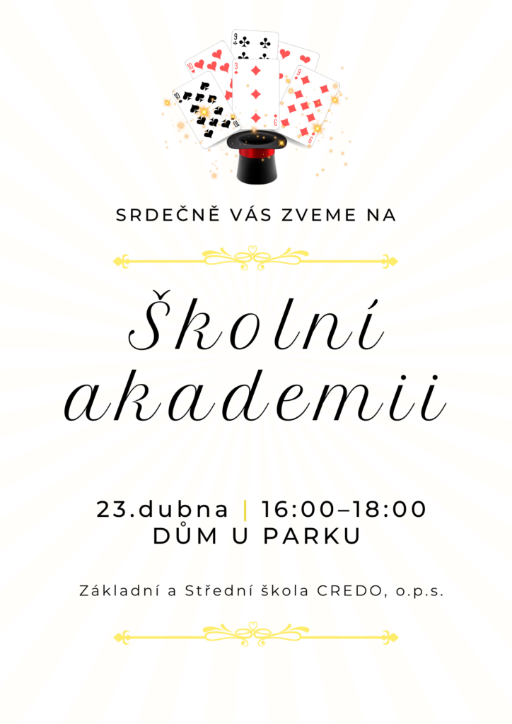 Milí rodiče a přátelé školy, srdečně vás zveme na naši letošní Školní akademii, která se uskuteční ve čtvrtek 23. dubna od 16:00 v Domě u Parku.