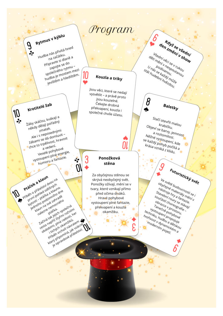 Přijďte se podívat na příběhy, které ožívají jen díky odvaze a fantazii našich žáků. Čeká vás podívaná, kde se tréma rozpouští v úsměvech a kde každý z nás může být na chvíli hvězdou!